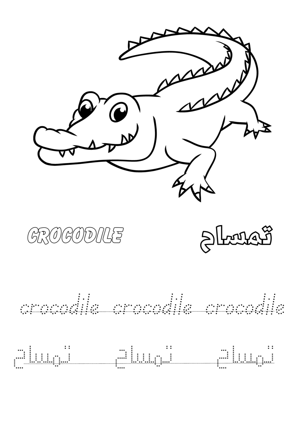 Animal coloring pages and writing animal names in English and Arabic